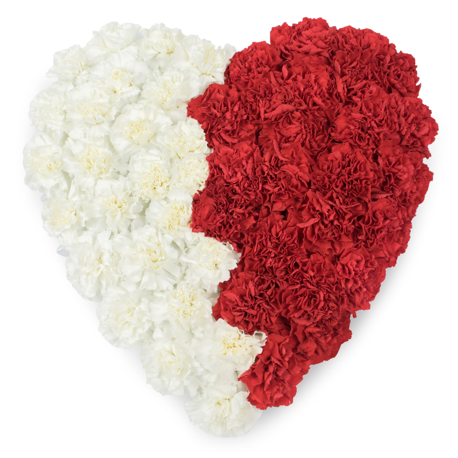 Celebrate the beauty and love with our heart-shaped carnation bouquet, featuring an exquisite mix of red and white carnations. This unique arrangement is designed to convey heartfelt sympathy with elegance and grace.