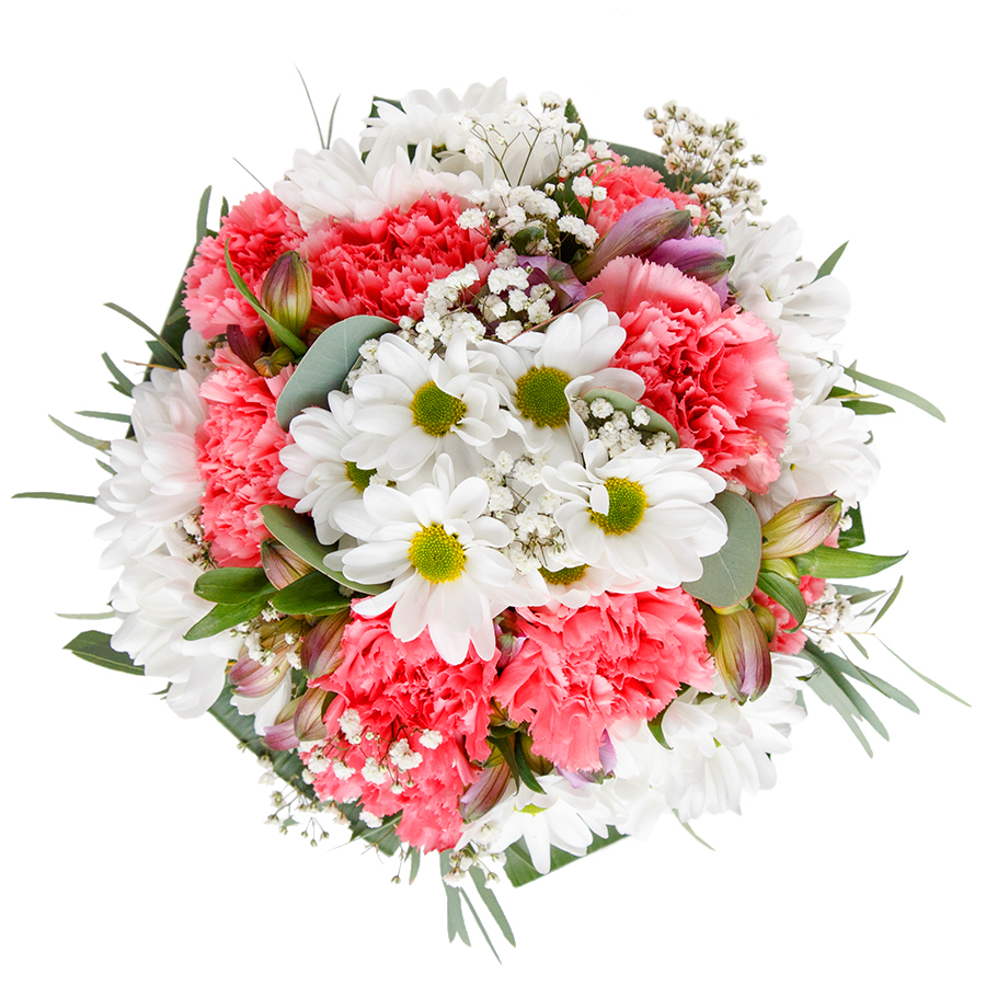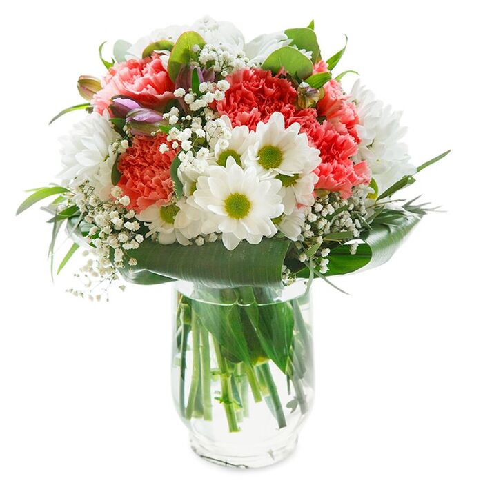 Our captivating bouquet combines snow-white chrysanthemums, ethereal gypsophila, and elegant light pink carnations, all gracefully arranged with lush aspidistra leaves. This exquisite blend offers a perfect balance of color and texture.